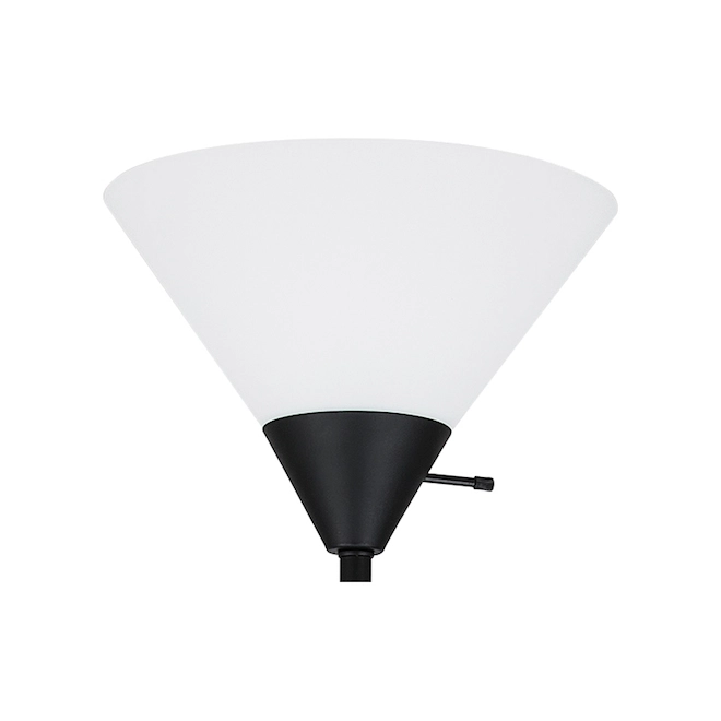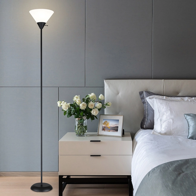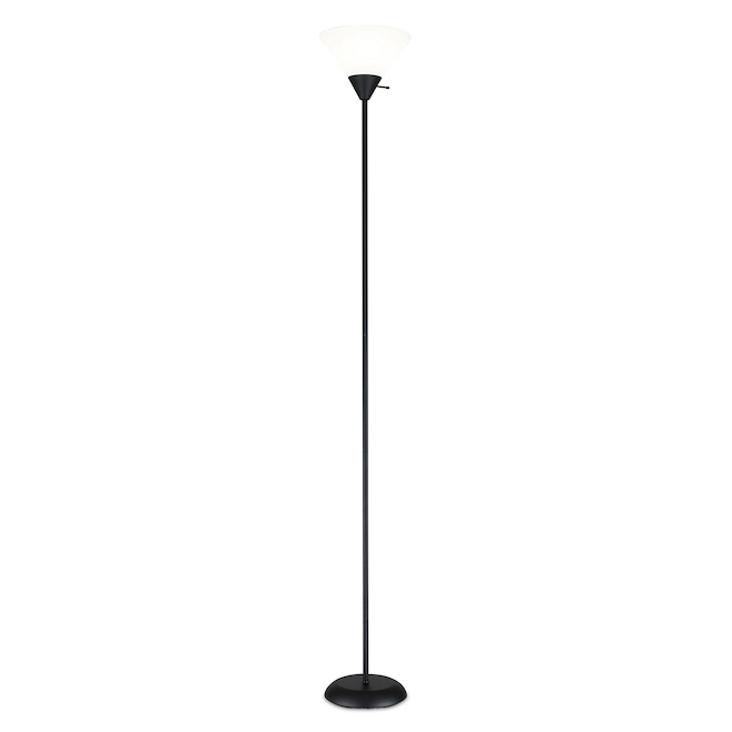 Bring contemporary style to a living room, bedroom or dining room with this 72-inch high black floor lamp from Project Source. Featuring a white frosted lightweight plastic shade, it provides a warm light spread. The lamp requires one 150 W A19 3-way bulb or LED equivalent (sold separately).