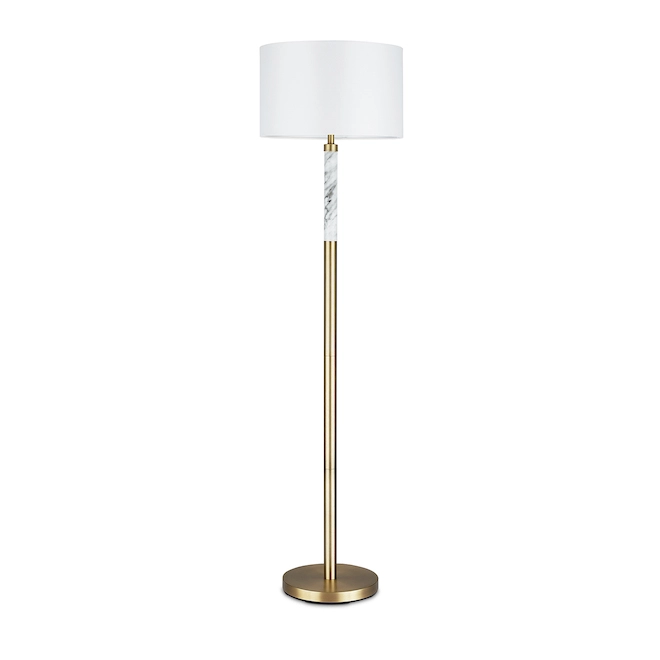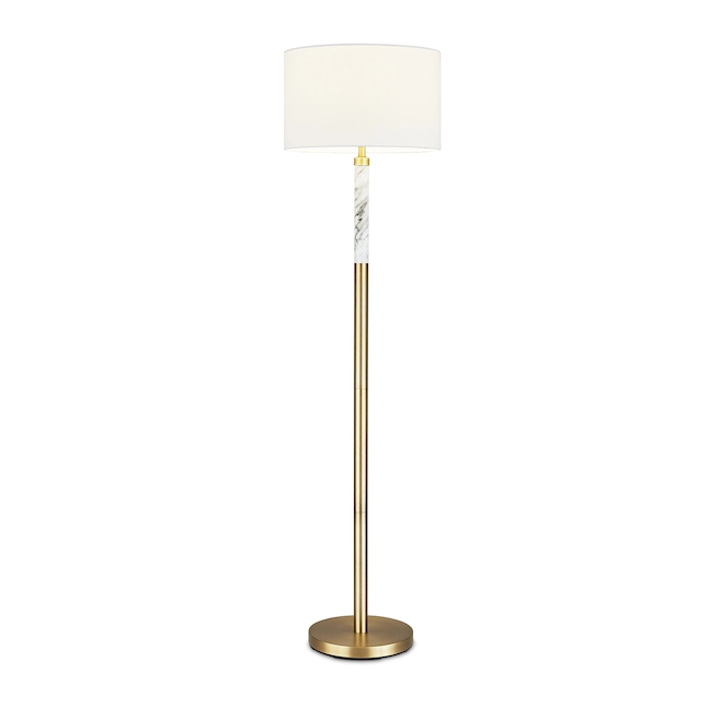 Add lighting to your living space with this Project Source floor lamp. Measuring 62 inches in height, it features an antique brass finish with a white linen shade and has an upper faux marble pole that gives it a unique look. This lamp will be a great addition to transitional decors. It requires one 150 W type A 3-way bulb or LED equivalent (not included).