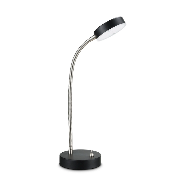 Ideal for modern work and home spaces, this matte black and brushed nickel finish desk lamp from Project Source has an adjustable gooseneck and integrated LED light so there is no bulb to replace. The 13.25-in lamp does not require assembly and is equipped with a convenient toggle switch on the base to control the lighting.