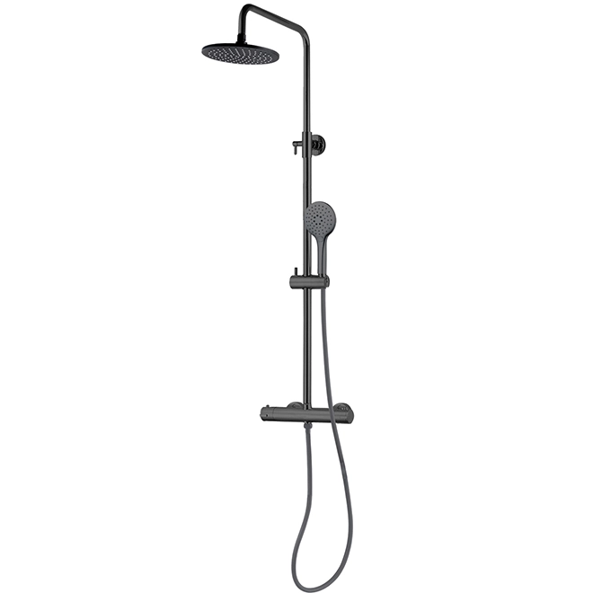 Modernize your shower with this Project Source adjustable shower column. The round-shaped rain showerhead and 3-function handheld spray showerhead have easy-to-clean nozzles. The unit is equipped with a thermostatic cartridge, a sliding rail and a 59-inch flexible hose ensuring the hand shower is easy to reach and simple to use. The set is offered here in a sleek and trendy black finish.