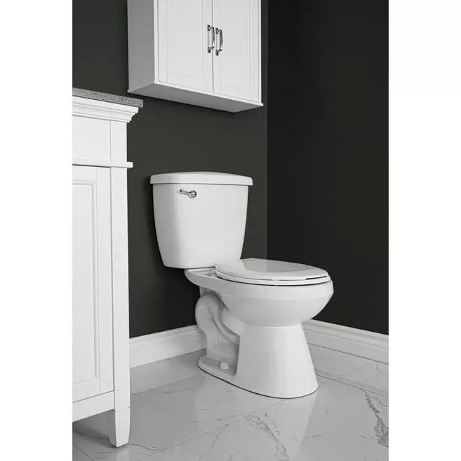 This single flush 2-piece toilet from Project Source delivers outstanding performance for its value. This model features a round, regular height white bowl, an insulated tank, and a rust-resistant chrome lever. This high-efficiency toilet has a flush capacity of 1000 g and comes with a plastic seat, a wax ring, and floor bolts. It’s backed by a 5-year limited warranty on porcelain and a 1-year limited warranty on other parts.
