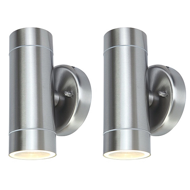 Illuminate your outdoor space with this Uberhaus 2-Light Outdoor Wall Sconce. The stainless steel finish shade will suits any exterior space. The outdoor light requires two 35-watt GU10 bulb (not included). Pack of 2.
